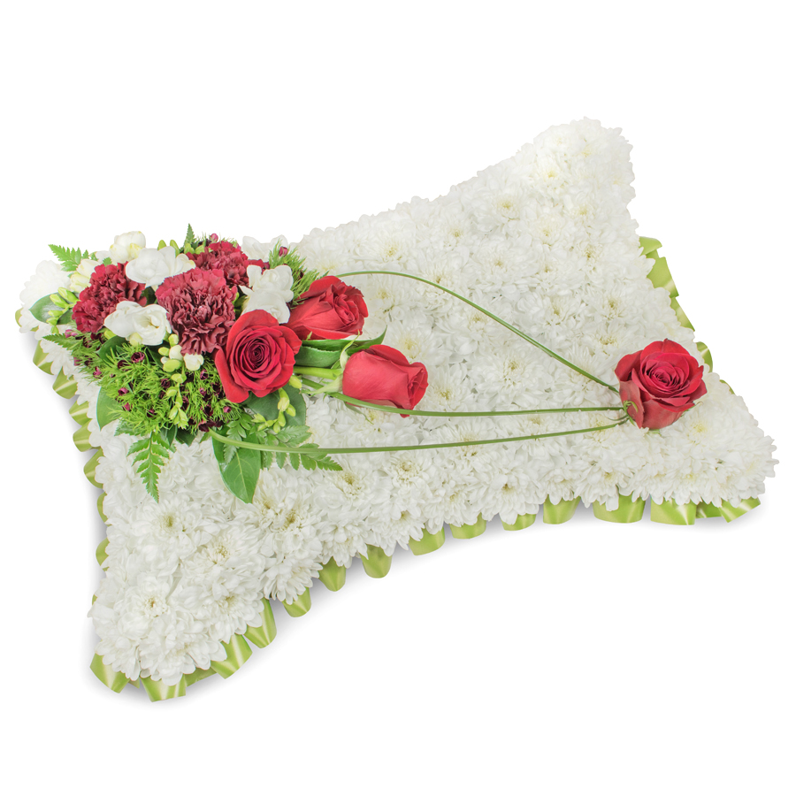 Offer a meaningful expression of sympathy with our unique flower arrangement. Expertly designed, the bouquet combines the delicate charm of white chrysanthemums, the passion of red roses, the purity of white freesias, and dark red carnations along with the graceful accents of dianthus and bear grass.